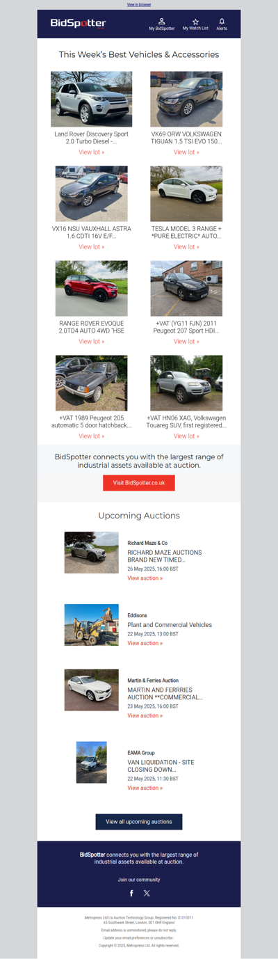 Bidspotter.co.uk is an online auction platform that specializes in industrial and commercial equipment auctions. It connects buyers with a wide range of assets, including machinery, tools, and vehicles, from various sellers. The site provides detailed listings, auction schedules, and bidding options, making it easy for users to participate in live and timed auctions.