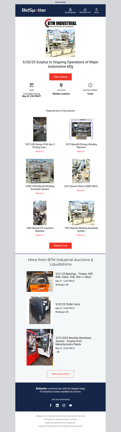 bidspotter.com is an online auction platform that specializes in industrial and commercial equipment. It connects buyers with a wide range of auction listings, including machinery, tools, and real estate from various industries. Users can browse upcoming auctions, place bids in real-time, and access detailed descriptions and images of items. BidSpotter aims to provide a convenient and efficient way for businesses and individuals to buy and sell equipment, making it a valuable resource for those looking to participate in online auctions.