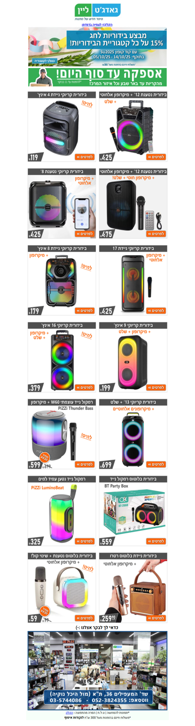 🔉🎵 בידוריות במבצע לחג עם קוד קופון 15% הנחה על כל הבידוריות בקטגוריה | פרסומת