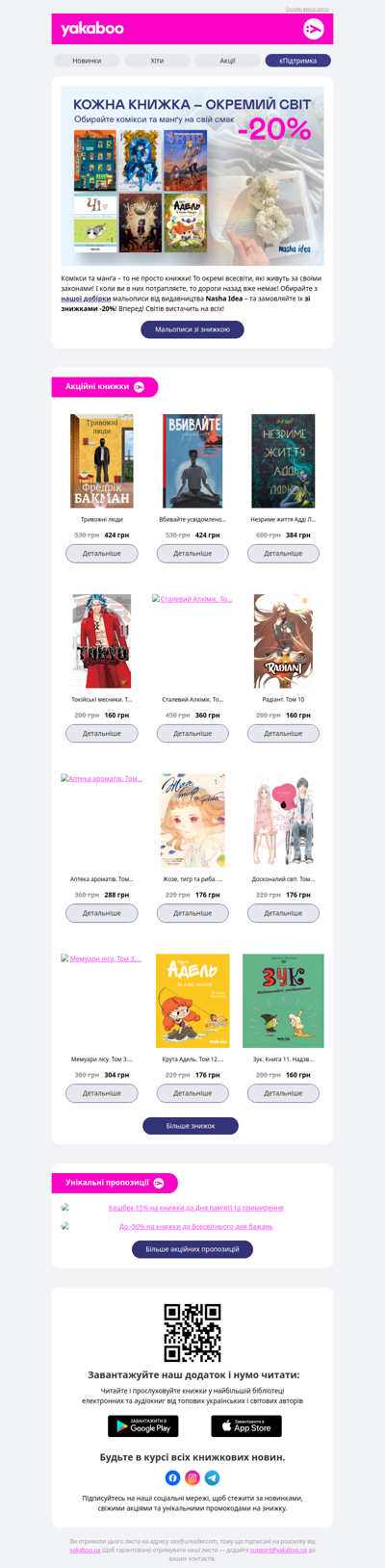 Національна книжкова платформа Yakaboo – це найбільший книжковий онлайн-магазин в Україні. Наша місія – зробити Україну найбільш читаючою країною Європи. Адже народ, який читає навіть під час війни, непереможний.