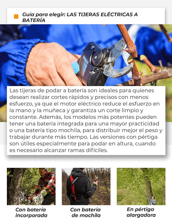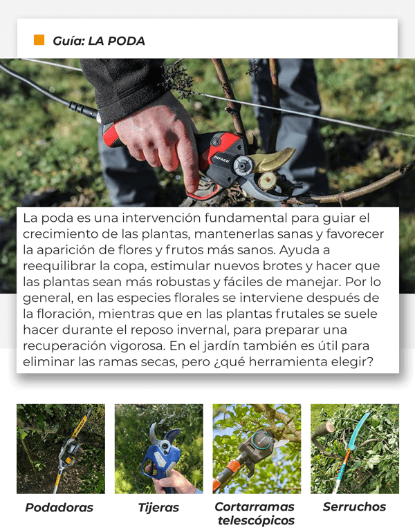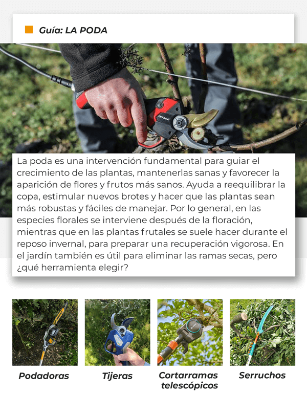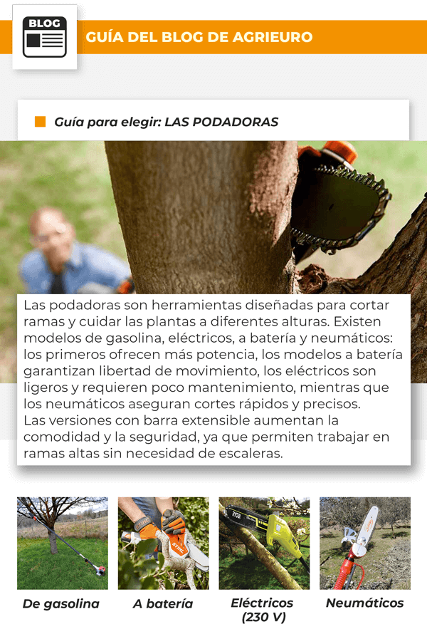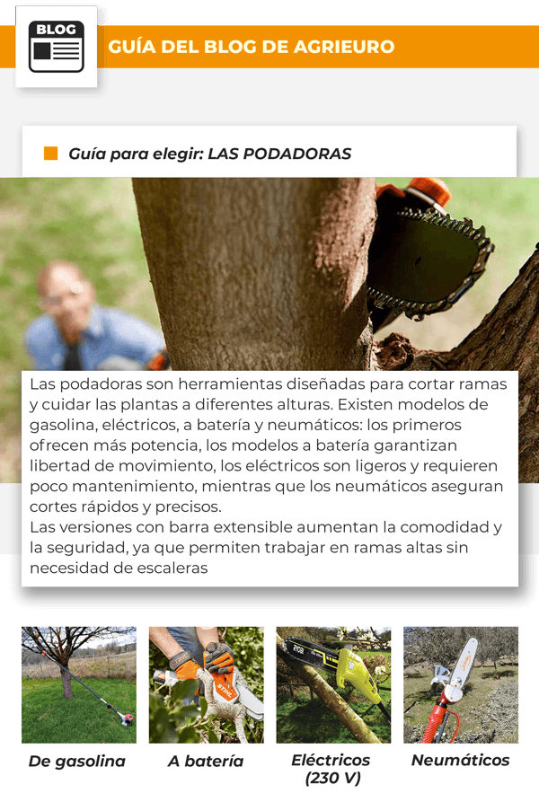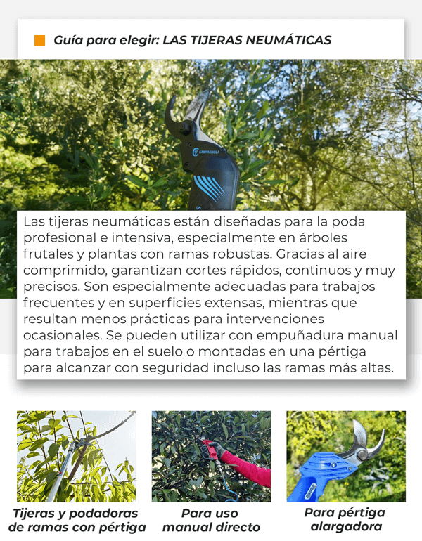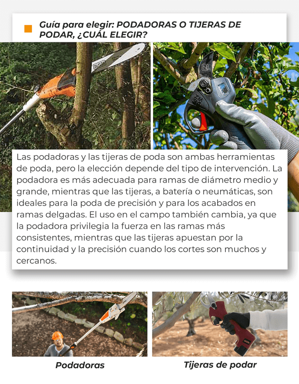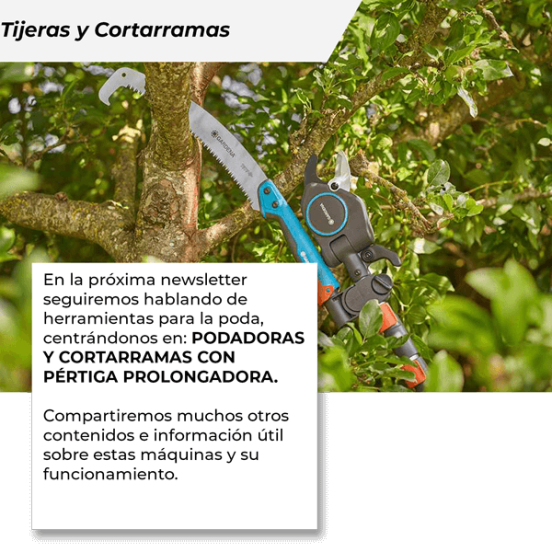 para podar de forma eficaz y segura se necesitan herramientas prácticas y adecuadas para cada tipo de trabajo, desde las ramas más finas hasta las más gruesas. En esta newsletter hablaremos de las principales categorías diseñadas para estas necesidades: LAS PODADORAS, LAS TIJERAS ELÉCTRICAS A BATERÍA Y LAS TIJERAS NEUMÁTICAS.