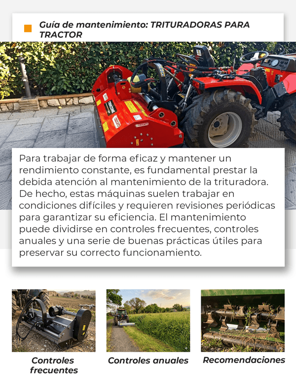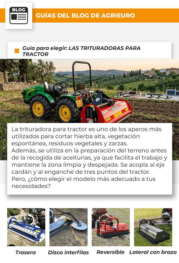Descubre un montón de contenido útil, desde las guías de nuestro blog sobre cómo elegir la trituradora para tractor más adecuada, hasta consejos para su mantenimiento, pasando por vídeos dedicados a su funcionamiento, pensados para ayudarte a encontrar el modelo que mejor se adapte a tus necesidades. No te pierdas la oportunidad de descubrir todo lo que hay que saber.