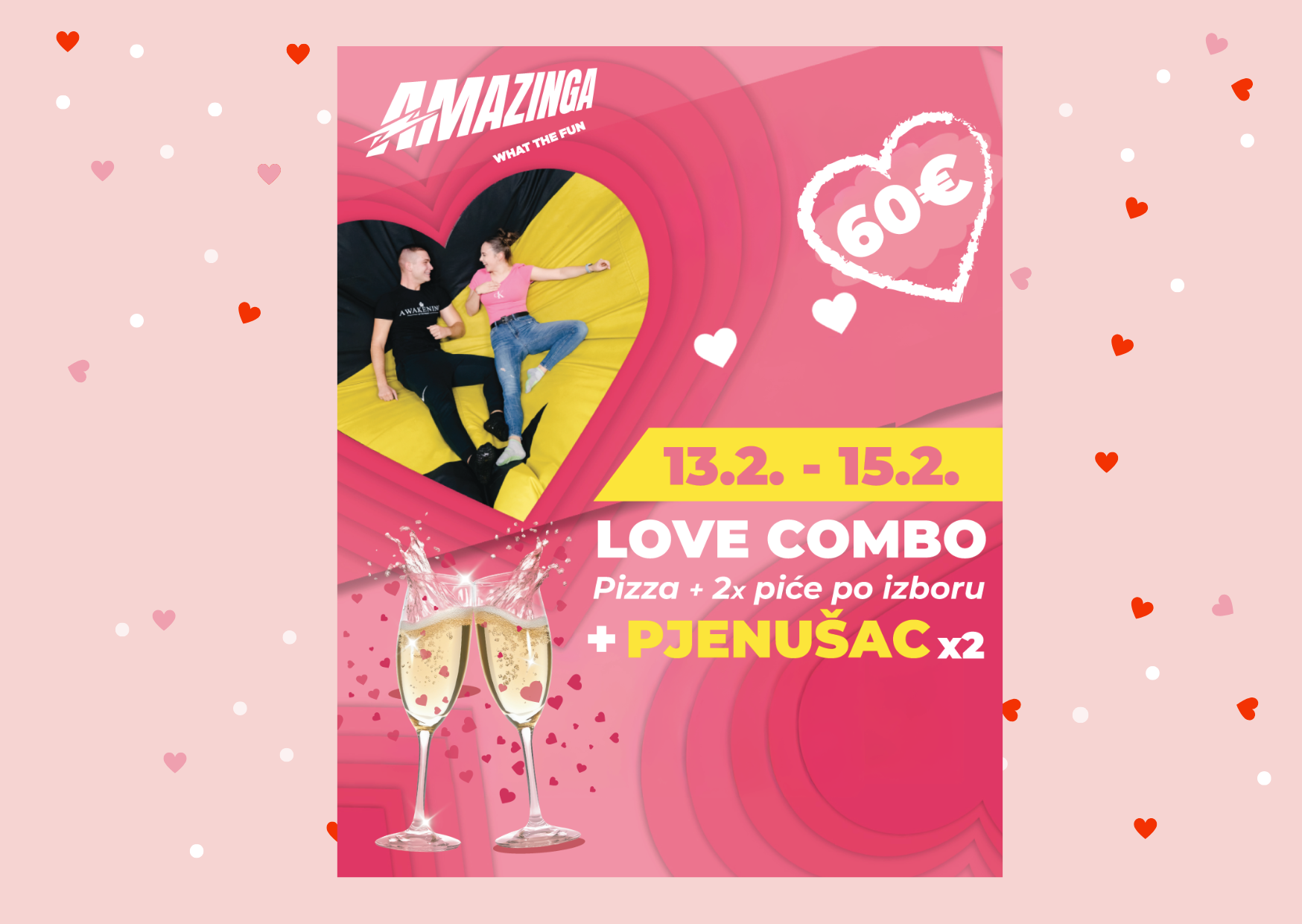Uživajte zajedno na trampolinima, testirajte hrabrost u adrenalinskom parku i zoni za penjanje, a za savršen završetak čeka vas čaša pjenušca za tebe i tvoju bolju polovicu 🥂🥂