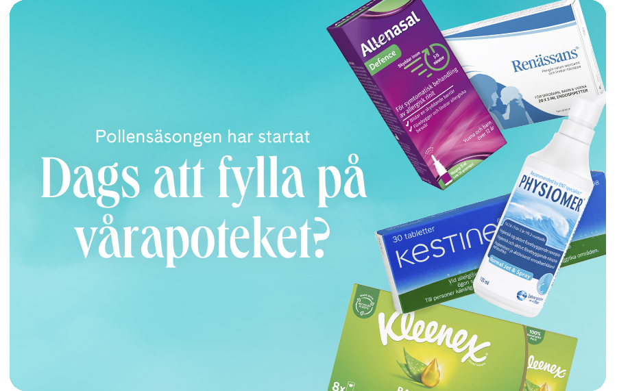 Kliande ögon och rinnande näsa? Med antihistamin, nässpray och ögondroppar blir du redo för pollensäsongen på ett ögonblick. Fyll på vårapoteket med upp till 20% rabatt och möt våren med mindre nys och mer njut.¹