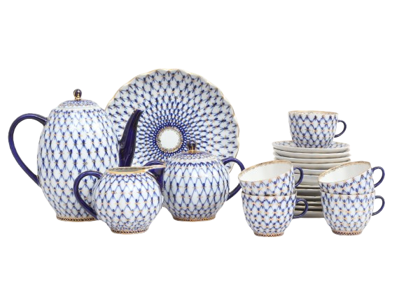 5 koppar med fat, 6 assietter, kanna, gräddkanna, sockerskål samt skålfat  |   |    |  Flöten 6 stycken