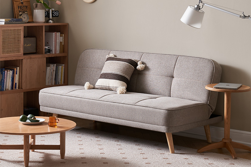 Japandi-inspired design. 2-in-1 sofa bed. Easily converts into a bed. Multifunctional. Textured fabric upholstery. Versatile and space-saving.
