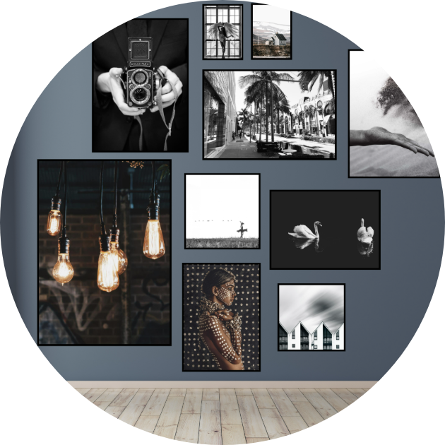 Bland størrelser, farger og materialer helt fritt. Ingen regler, bare personlighet. Begynn med den største rammen i midten og bygg utover. Bruk både stående og liggende rammer for dynamikk.