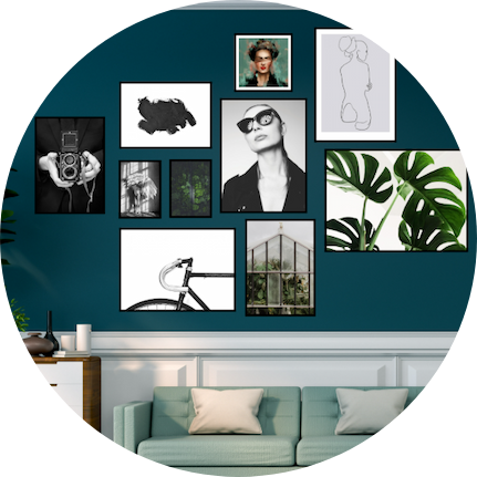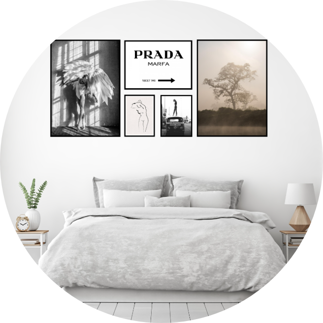 Tips: Legg ut rammene på gulvet først og test layouten før du borer. Washitape på veggen fungerer også perfekt for å markere hvor rammene skal henge. Vil du ha flere stiler, ferdige maler og kundeinspirasjoner? Vi har skrevet en hel guide.