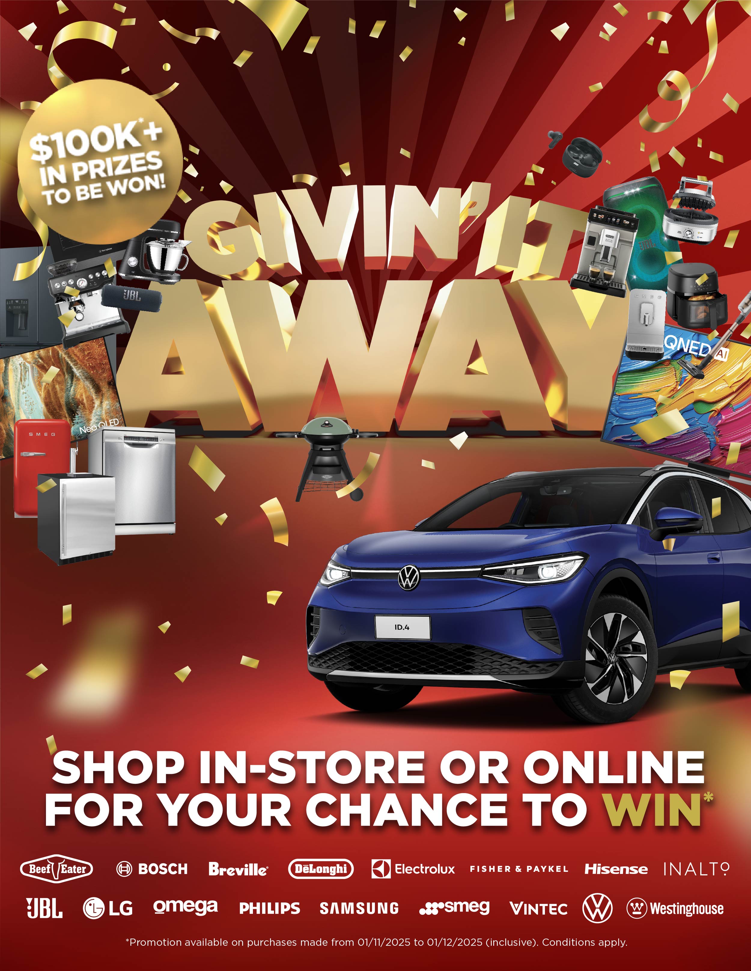 WIN*Promotion available on purchases made from 01/11/2025 to 01/12/2025 (inclusive), while stocks last. Promotion is only available on purchases made from a Bing Lee bricks and mortar retail store or online at www.binglee.com.au, for personal shoppers only. Excludes Asko, Miele, Agency and all Proforma brands. Conditions apply. For full terms and conditions, please visit www.binglee.com.au/help/givinitawayterms