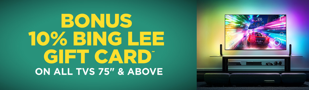 ~Purchase any TV 75" & above (“Participating Products”) at any Bing Lee bricks and mortar retail store or online at www.binglee.com.au and receive a 10% Bing Lee Bonus Gift Card (“Bonus Gift Card”). Promotion available on qualifying purchases made from 22/01/2026 to 28/01/2026 (inclusive), while stocks last and may be withdrawn or extended at any time by Bing Lee ("Promotional Period"). With the exception of Extended Warranties, Bonus Gift Card can only be used on future purchases and can be redeemed at any Bing Lee retail store or online at www.binglee.com.au within 3 months of the qualifying purchase. This Promotional Offer cannot be used in conjunction with any other offer (including but not limited to Bing Lee’s Competitor’s Pricing Policy) or promotion. Bonus Gift Card is not refundable and not redeemable for cash, credit or the purchase of any Gift or Bonus Gift Card. If Customer cancels or returns a purchase of a Participating Product, Customer must either return the unused Bonus Gift Card to Bing Lee or the value of the Bonus Gift Card will be deducted from any refund provided to the Customer as a result of the cancelled transaction. For personal shoppers only and purchase quantities are limited to a maximum of three (3) of the same Participating Products per Customer during the Promotional Period. Conditions apply. Visit https://www.binglee.com.au/articles/help/bonus-gift-cards-terms-and-conditions for additional terms and conditions.