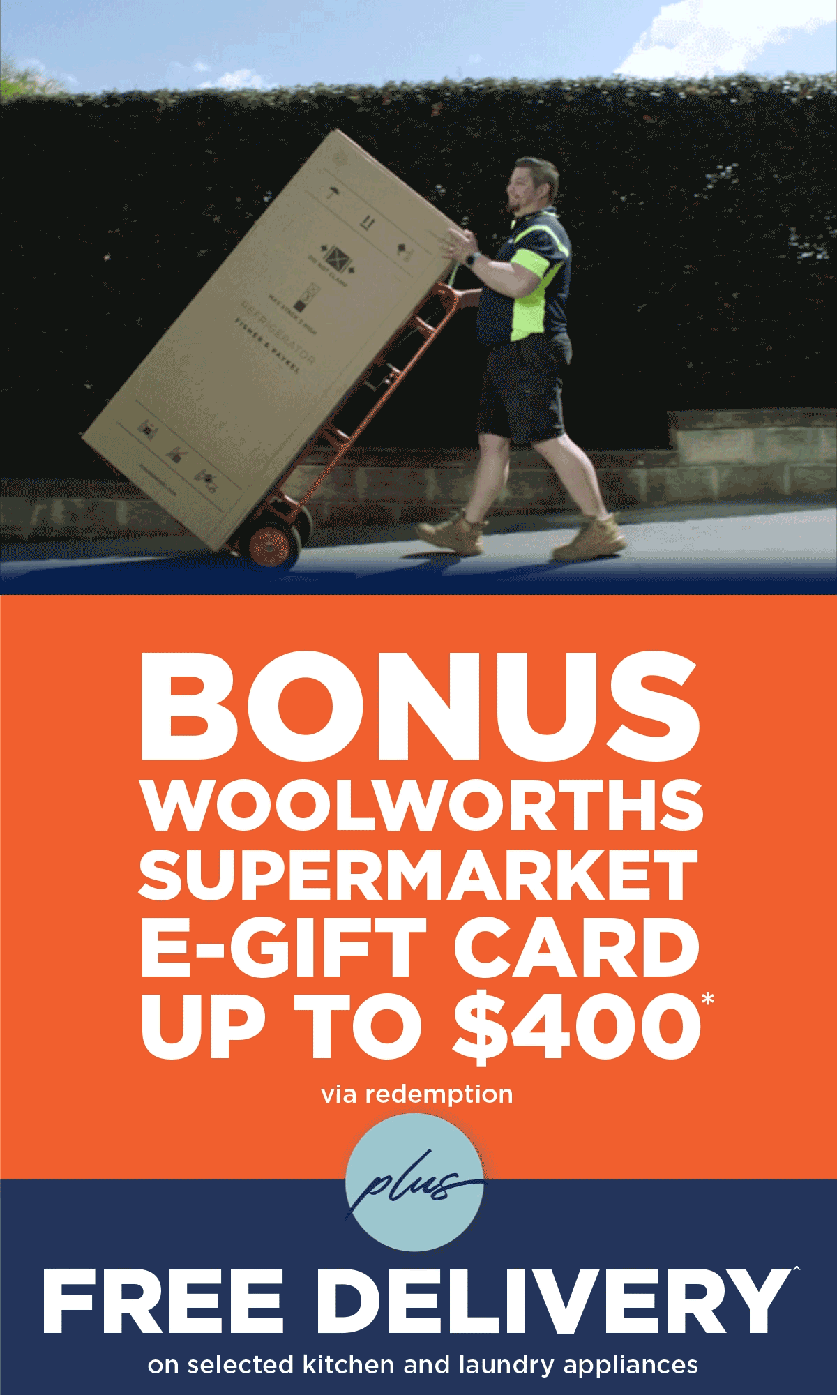 *Purchase a selected Kitchen or Laundry Appliance (“Participating Product(s)”) from a Bing Lee bricks and mortar retail store or online at www.binglee.com.au and receive a Woolworths Supermarket E-Gift Card up to the value of $400. Promotion available on qualifying purchases made between 01/03/26 to 31/03/26 or while stocks last (“Promotional Period”). Woolworths Supermarket E-Gift Card must be redeemed online at Bing Lee Electrics Pty Ltd before 30/04/26 (“Redemption Period”). Promotion cannot be used in conjunction with any other offer (including but not limited to Bing Lee’s Competitor’s Pricing Policy). Personal Shoppers only.
