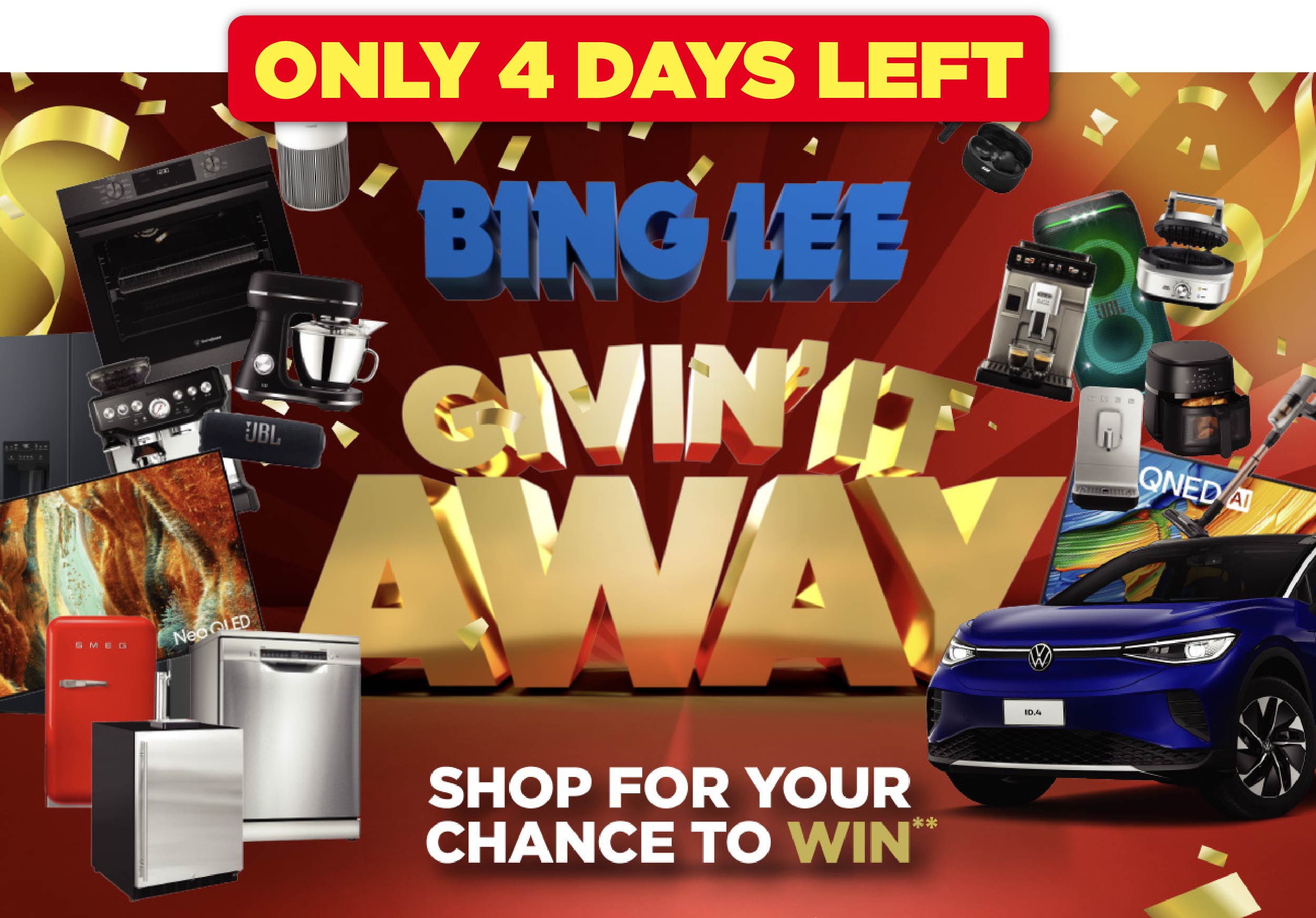 **Promotion available on purchases made from 01/11/2025 to 01/12/2025 (inclusive), while stocks last. Promotion is only available on purchases made from a Bing Lee bricks and mortar retail store or online at www.binglee.com.au, for personal shoppers only. Excludes Asko, Miele, Agency and all Proforma brands. Conditions apply. For full terms and conditions, please visit www.binglee.com.au/help/givinitawayterms
