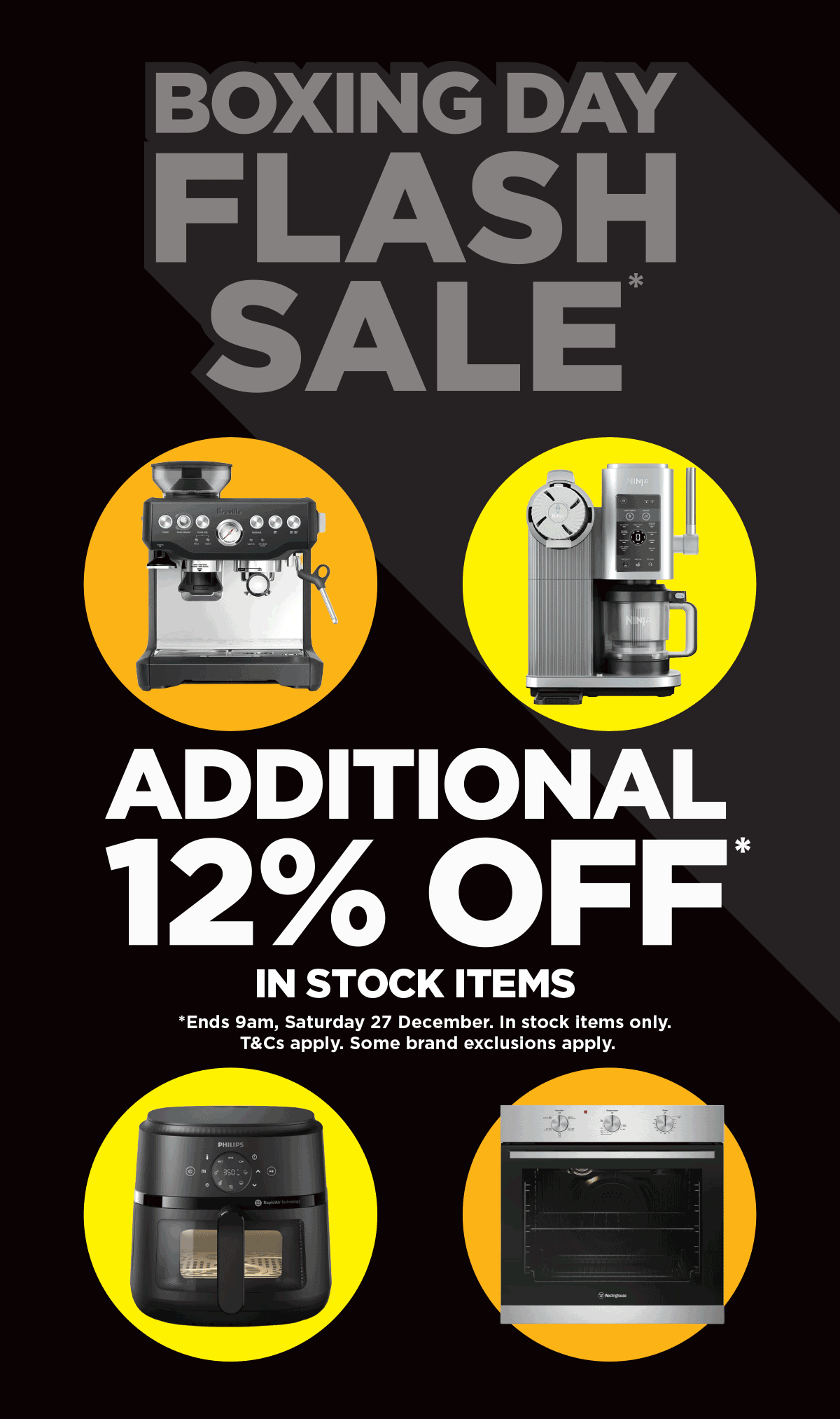 *Purchase any in-stock product listed for sale on www.binglee.com.au from 7PM (AEDT) 26/12/25 to 9AM (AEDT) 27/12/25 ("Promotional Period"), excluding the products listed below, and receive an additional 12% off the Total Advertised Purchase Price (excluding Delivery Charges). Discount applied automatically at checkout. This Promotional Offer is not available in-store, on eBay or any other site, or in conjunction with any other discount code at checkout. Customers may purchase multiple products, but not more than three (3) of the same products during the Promotional Period. Total Discount per Customer is capped at $1,000 per transaction. In the event that the Customer returns or seeks a refund for any products purchased, any refund will be calculated based on the amount actually paid by the Customer, including any discount applied. This does not affect the Customer’s rights under the Australian Consumer Law. Promotional Products exclude Apple, Dyson products and all Proforma brands (including but not limited to Asko, Bertazzoni, BH Fitness, Falcon, Falmec, Fisher and Paykel Agency, Liebherr, Lifespan, Miele, Neff, Smeg Agency, Turner and Hastings), Gift Cards and Extended Warranties, any products not listed for sale on www.binglee.com.au, out of stock items, pre-order models, backorders and the following product models: KLF03WHAU, KLF03BLAU, TSF01WHAU, KLF03CRAU, KLF03PBAU, KLF03PGAU, TSF01BLAU, TSF01PGAU, TSF01PBAU, TSF01CRAU, KLF03SBMAU, TSF01SBMAU, KLF03EGMAU and TSF01EGMAU. Purchases can be collected from customer's closest Bing Lee store or delivered (Delivery Charges will apply, and Next Day Delivery not available). Commercial Shoppers excluded. Bing Lee reserves its rights to cancel or reverse any orders not made in good faith, including, but not limited to, fraudulent, bulk-buying, or automated purchasing behaviour.
