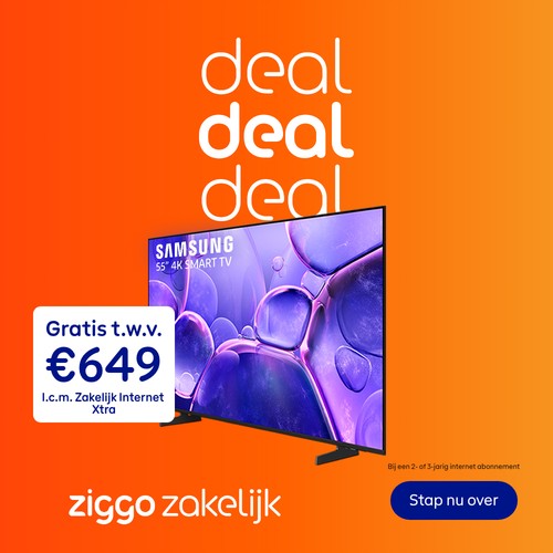 Op volle kracht ondernemen met Ziggo Zakelijk en nu met extra voordeel! Je kunt namelijk zelf kiezen: superhoge korting, een Samsung Smart TV t.w.v. €649,- of €400,- bol cadeaukaart! Stel jouw ideale pakket nu samen, kies jouw voordeel en geniet van zorgeloos ondernemen waar je ook bent.