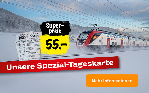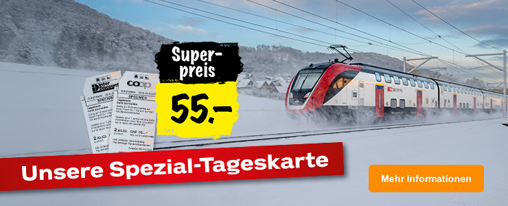 Erkunden Sie die ganze Schweiz zum Schnäppchen-Preis! Sichern Sie sich jetzt bis am 4.3.2026 Ihre Spezial-Tageskarte für nur CHF 55.– (solange Vorrat) und erkunden Sie an einem Tag Ihrer Wahl die ganze Schweiz (einlösbar bis am 1.4.2026)! Ob allein oder in der Gruppe, mit Familie oder Freunden - entdecken Sie die schönsten Orte der Schweiz im GA-Bereich. Geniessen Sie eine entspannte Fahrt und ein aussergewöhnliches Erlebnis zum Superpreis.