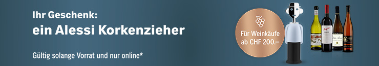 Jetzt lohnt sich Ihr Online-Einkauf ganz besonders: Ab einem Weineinkauf von CHF 200.- (exkl. Subskriptionen) erhalten Sie einen Alessi Korkenzieher geschenkt.