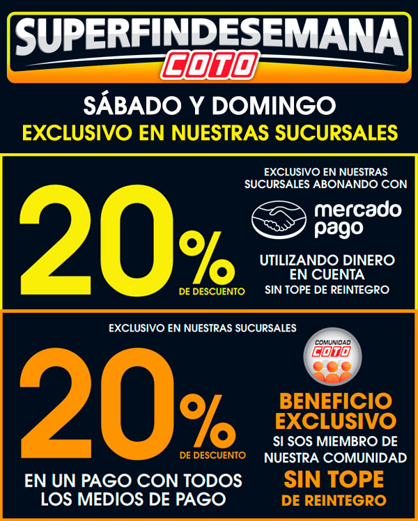 PARA MÁS INFORMACIÓN Y CONDICIONES O LIMITACIONES APLICABLES, BUSCAR EN COTO.COM.AR/LEGALES SECCIÓN “DESCUENTOS SÁBADO Y DOMINGO”.
