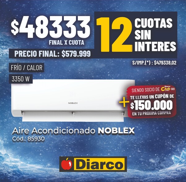 BENEFICIO EXCLUSIVO PARA SOCIOS DIARCO CLUB: QUIENES ADQUIERAN LOS PRODUCTOS MENCIONADOS DURANTE EL PERÍODO PROMOCIONAL RECIBIRÁN UN CUPÓN DE DESCUENTO PARA UTILIZAR EN UNA COMPRA POSTERIOR, CORRESPONDIENDO UN CUPÓN DE $300.000 (FINAL) POR LA COMPRA DEL SKU 85962 Y UN CUPÓN DE $150.000 (FINAL) POR LA COMPRA DEL SKU 85930. EL CUPÓN SE EMITIRÁ ÚNICAMENTE POR COMPRAS REALIZADAS ENTRE EL 02/03/2026 Y EL 31/03/2026, SERÁ DE USO ÚNICO Y VÁLIDO PARA APLICAR SOBRE EL TOTAL DE LA COMPRA, SIN RESTRICCIONES DE CATEGORÍAS. EL CUPÓN SERÁ HABILITADO A LOS 4 (CUATRO) DÍAS CORRIDOS DE REALIZADA LA COMPRA DEL AIRE ACONDICIONADO Y PODRÁ UTILIZARSE DURANTE 7 (SIETE) DÍAS CORRIDOS DESDE SU ACTIVACIÓN, INDICÁNDOSE EN EL MISMO LAS FECHAS EXACTAS DE VIGENCIA. VÁLIDO EN SUCURSALES DIARCO ADHERIDAS DEL PAÍS. SE DEBERÁ PRESENTAR EL CUPÓN JUNTO CON EL DNI DEL TITULAR. UN CUPÓN POR PRODUCTO ADQUIRIDO. NO ACUMULABLE CON OTRAS PROMOCIONES, DESCUENTOS NI BILLETERAS VIRTUALES. NO CANJEABLE POR DINERO EN EFECTIVO. NO PARTICIPAN VENTAS A COMERCIANTES, VENTAS POR OFICINA NI ENVÍOS. CUPONES DAÑADOS, ADULTERADOS O ILEGIBLES SERÁN INVÁLIDOS. LA PARTICIPACIÓN IMPLICA EL CONOCIMIENTO Y ACEPTACIÓN DE LAS PRESENTES CONDICIONES.