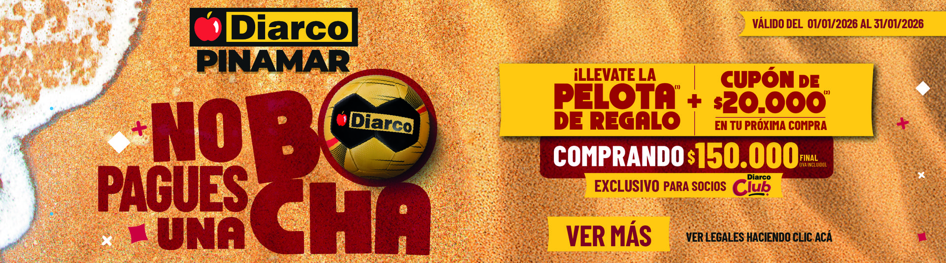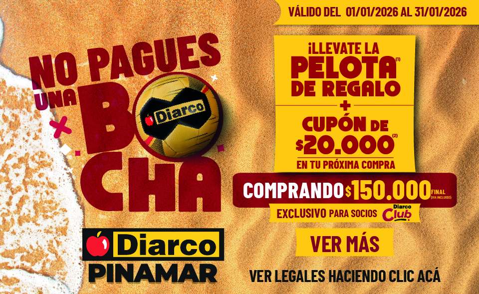 PROMOCIÓN VÁLIDA DEL 01/01/2026 AL 28/02/2026. LOS SOCIOS DIARCO CLUB QUE REALICEN UNA COMPRA DE $150.000 (PRECIO FINAL) O MÁS EN LA SUCURSAL DIARCO PINAMAR RECIBIRÁN UN CUPÓN IMPRESO PARA UTILIZAR EN UNA COMPRA POSTERIOR. EL CUPÓN OTORGA UN BENEFICIO DE $20.000 (FINAL) CON UNA COMPRA MÍNIMA DE $100.000 (FINAL). EL CUPÓN SERÁ ACTIVADO A LOS 4 (CUATRO) DÍAS DE RECIBIRLO Y TENDRÁ UNA VIGENCIA DE 15 (QUINCE) DÍAS DE CORRIDOS DESDE SU ACTIVACIÓN. LAS FECHAS EXACTAS DE VIGENCIA ESTARÁN INDICADAS EN EL CUPÓN IMPRESO. VÁLIDO EN TODAS LAS SUCURSALES DIARCO DEL PAÍS. SE DEBE PRESENTAR EL CUPÓN FÍSICO JUNTO CON EL DNI DEL TITULAR. UN CUPÓN POR COMPRA. NO ACUMULABLE CON OTROS DESCUENTOS, PROMOCIONES NI BILLETERAS VIRTUALES. NO CANJEABLE POR DINERO. NO PARTICIPAN VENTAS A COMERCIANTES, VENTAS POR OFICINA NI ENVÍOS. CUPONES DAÑADOS, ADULTERADOS O ILEGIBLES SERÁN INVÁLIDOS. LA PARTICIPACIÓN IMPLICA LA ACEPTACIÓN DE LAS PRESENTES CONDICIONES.
