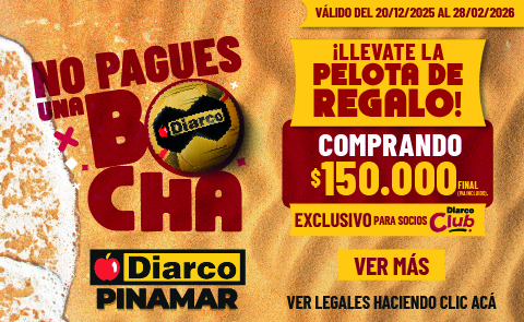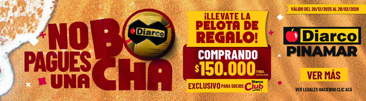 PROMOCIÓN VÁLIDA DEL 20/12/2025 AL 28/02/2026, O HASTA AGOTAR STOCK, LO QUE OCURRA PRIMERO. VÁLIDA EXCLUSIVAMENTE EN LA SUCURSAL UBICADA EN RUTA N.º 11 KM 397, PARTIDO DE GENERAL MADARIAGA, PROVINCIA DE BUENOS AIRES. POR CADA COMPRA DE $150.000 (PRECIO FINAL) O MÁS REALIZADA POR SOCIOS DIARCO CLUB Y EFECTUADA EN EL SALÓN DE VENTAS, EL CLIENTE RECIBIRÁ SIN CARGO UNA (1) PELOTA DE FÚTBOL N.º 5 MARCA DIARCO (CÓD. ALICFB251). UNA (1) PELOTA POR CLIENTE Y POR COMPRA. NO ACUMULABLE: NO SE ENTREGARÁN PELOTAS ADICIONALES POR ALCANZAR MÚLTIPLOS DEL MONTO MÍNIMO EN UNA MISMA COMPRA. NO VÁLIDA PARA VENTAS A COMERCIANTES, VENTAS POR OFICINA NI COMPRAS MEDIANTE ENVÍOS. EL OBSEQUIO NO ES CANJEABLE POR DINERO NI POR OTROS PRODUCTOS. PARTICIPACIÓN SIN OBLIGACIÓN DE COMPRA: ENVIAR UN DIBUJO HECHO A MANO Y CON PRECISIÓN EXACTA DE LA FACHADA DE LA SUCURSAL PINAMAR A INFO@DIARCO.COM.AR. SI EL DIBUJO COINCIDE CON LA FACHADA, SE ENVIARÁ UNA RESPUESTA DENTRO DE UN PLAZO MÁXIMO DE 10 DÍAS HÁBILES INDICANDO DÍA Y LUGAR DE RETIRO DE LA PELOTA.
