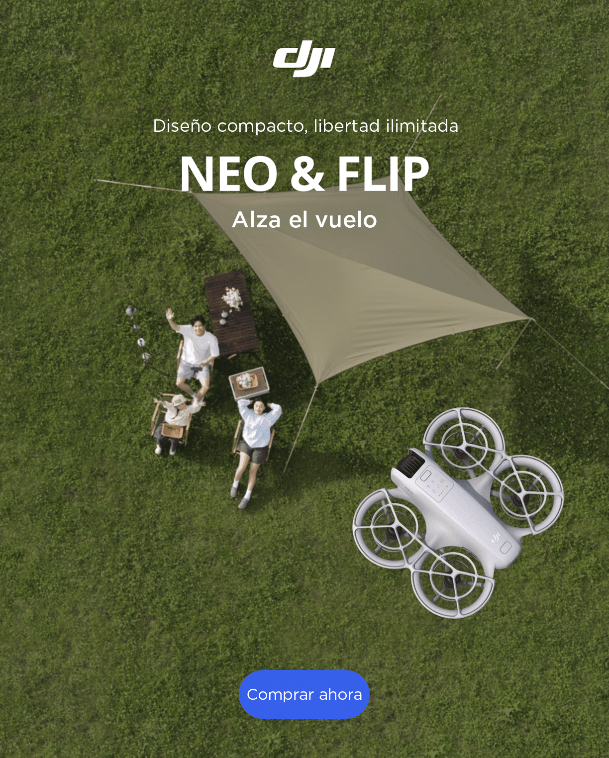Si buscas algo ligero, estable y confiable, esta es una opción en la que no debes pensarlo dos veces. | DJI Neo Un dron del tamaño de la palma de la mano para vlogs | | | Ultra seguro, ultra confiable Equipado con un protector de hélice plegable de cobertura total para un vuelo seguro y un sistema de detección infrarroja 3D para frenado automático incluso de noche. |  | | | | | Captura increíbles fotos de 48 MP con el sensor CMOS de 1/1,3 pulgadas, con fusión ISO nativa dual, una apertura de f/1,7 y píxeles 4 en 1 de 2,4 μm. |  | | | Escenario central con seguimiento de sujetos | DJI Neo te mantiene perfectamente encuadrado mientras andas en bicicleta, patinas o caminas, garantizando tomas cautivadoras que siguen tu ritmo sin esfuerzo. |  |