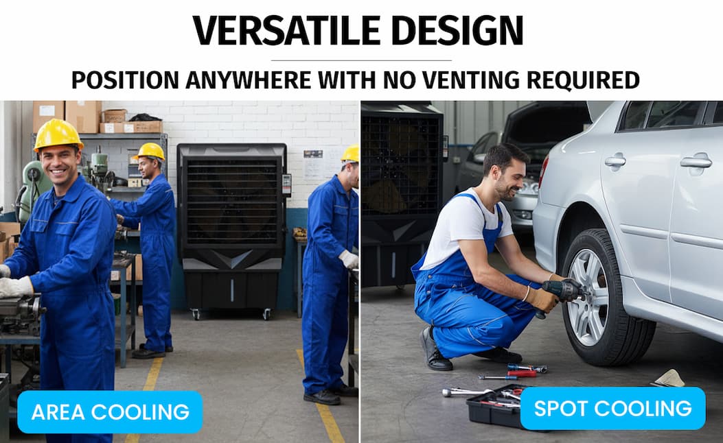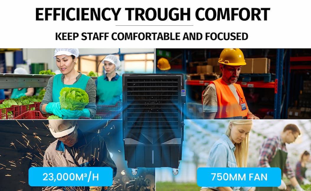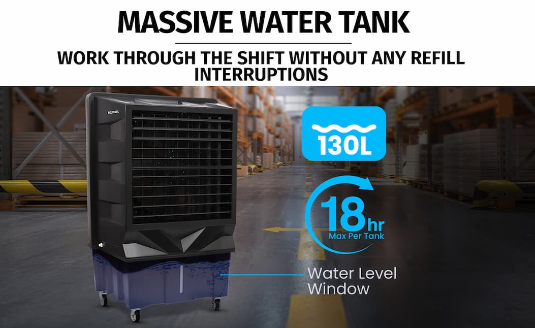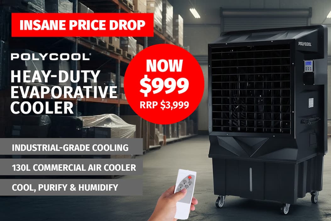 Perfect for workshops, warehouses, or any busy space, the POLYCOOL 130L 750W Evaporative Air Cooler Commercial Industrial Grade Remote Control Purifier Humidifier Fan combines strong airflow, easy remote operation, and improved air quality — all for $1,199 (RRP $3,999).