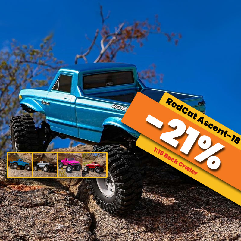 Ascent-18 med 4WD og portalaksler, bygger på storebror Redcat Ascent Fusion BL, og leveres helt komplett og klar til å kjøre. Ascent er utrustet med oljefylte dempere med alu caps og hele karosseriet kan tiltes bakover etter bare å rotere på en enkel mutter som gir deg enkel tilgang til elektronikken. Store dekk gir tøft utseende med gode klatreegenskaper og bilen leveres med et oppladbart 2s 750mah LiPo-batteri som gir lang kjøretid. |