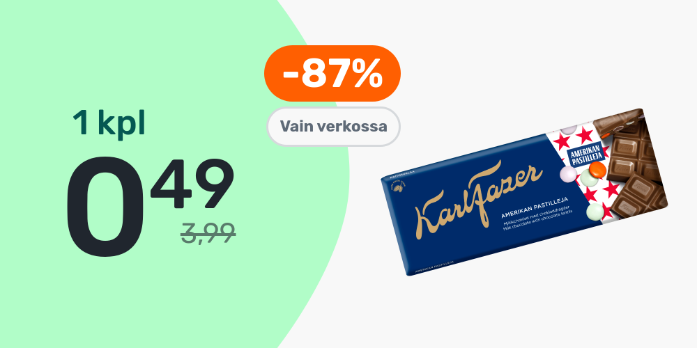 Hinnat ovat voimassa rajoitetun ajan ja tuotteita on saatavilla rajoitetusti. PidÀtÀmme oikeudet muutoksiin. Tuotteiden tilausmÀÀrÀÀ voi olla rajoitettu. Vertailuhintana kÀytetÀÀn suurten pÀivittÀistavarakauppojen normaalihintaa, jonka perusteella alennusprosentit on laskettu.