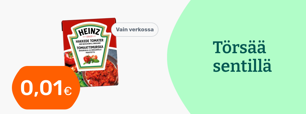 Hinnat ovat voimassa rajoitetun ajan ja tuotteita on saatavilla rajoitetusti. Pidätämme oikeudet muutoksiin. Tuotteiden tilausmäärää voi olla rajoitettu. Vertailuhintana käytetään suurten päivittäistavarakauppojen normaalihintaa, jonka perusteella alennusprosentit on laskettu.