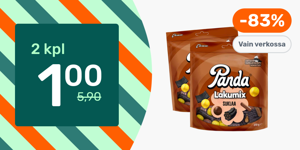 Hinnat ovat voimassa rajoitetun ajan ja tuotteita on saatavilla rajoitetusti. Pidätämme oikeudet muutoksiin. Tuotteiden tilausmäärää voi olla rajoitettu. Vertailuhintana käytetään suurten päivittäistavarakauppojen normaalihintaa, jonka perusteella alennusprosentit on laskettu.