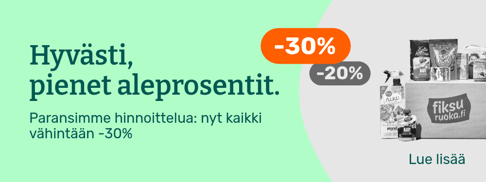 Hinnat ovat voimassa rajoitetun ajan ja tuotteita on saatavilla rajoitetusti. Pidätämme oikeudet muutoksiin. Tuotteiden tilausmäärää voi olla rajoitettu. Vertailuhintana käytetään suurten päivittäistavarakauppojen normaalihintaa, jonka perusteella alennusprosentit on laskettu.
