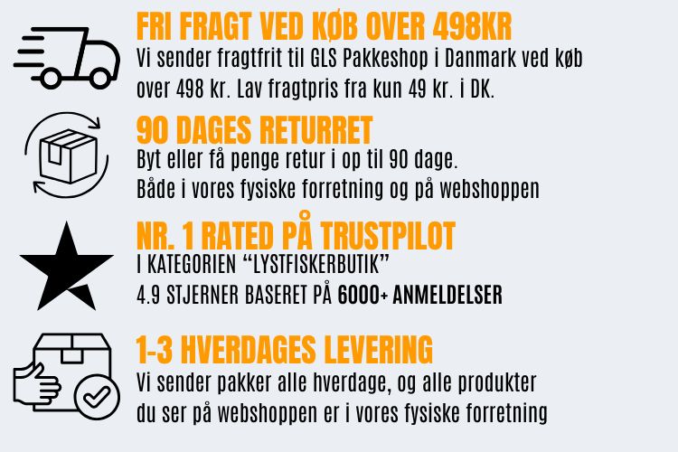 Hos Sport Dres og Fiskegrej.dk sender vi helt frem til fredag den 19. december kl. 14.00 med GLS. Så længe du bestiller inden da, er der levering inden jul.