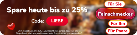| | Selena | | Wertgutschein Permanent Make-up | Rostock, MV 4,83 (6) | | 150,00 € 50,00 € | | 35 € mit Code GLOWUP, Endet am 7.2 | | | |  | | Colorland | | Fotobuch Classic A4 | | 29,99 € Ab 11,60 € | | 8,70 € mit Code LIEBE, Endet am 7.2 | | | | | | |  | | Dinotastic Live! Die Reise zum... | | Bestplatz-Ticket für „Dinotastic“ vom 08.02. - 29.03.26 in 9 Städten | Mehrere Standorte 4,83 (6) | | 29,90 € Ab 21,90 € | | 19,71 € mit Code LIEBE, Endet am 7.2 | | | |  | | Maanami | | 3, 5 oder 10 Anwendungen für Gewichtsmanagement mit Slimyonik-Methode | Rostock, MV 5 (5) | | 120,00 € Ab 39,90 € | | 29,92 € mit Code GLOWUP, Endet am 7.2 | | | | | | |  | | International NLP | | Online-Hypnotherapie-Zertifikat | | 597,00 € 49,00 € | | 36,75 € mit Code LIEBE, Endet am 7.2 | | | |  | | Technivision Germany | | Adobe Acrobat Pro 2018, 2019, 2020, 2024 oder 2025 | 68,19 € Ab 14,99 € Verkauf endet am 08.02 | | | | | | |  | | Colorland | | Fotobuch Exklusiv A4 | | 39,99 € Ab 14,95 € | | 12,71 € mit Code FOTO, Endet am 7.2 | | | |  | | Cervantes Idiomas | | Spanisch-Sprachkurs online | | 299,00 € Ab 19,90 € | | 17,91 € mit Code LIEBE, Endet am 7.2 | | | | | | |  | | Loriot - Die Ente bleibt draußen! | | Loriot - Die Ente bleibt draußen!: Ticket vom 02.01.-22.11.2026 | Mehrere Standorte 4,26 (457) | | | | |  | | Photo Gifts | | Fotobuch Hardcover | | 34,90 € Ab 6,99 € | | 5,94 € mit Code FOTO, Endet am 7.2 | | | | | | | |  | | Postando | | 1-5 Postkarten per App schicken | | 2,49 € Ab 1,86 € | | 1,58 € mit Code FOTO, Endet am 7.2 | | | |  | | | Gel-Memoryschaum-Matratze | | 980,00 € Ab 79,99 € | | 71,99 € mit Code FLASH, Endet am 8.2 | | | | | | |  | | | 1x oder 2x Mini-Kleid mit Spitze | 39,99 € Ab 8,49 € Sale Ends 08.02 | | | |  | | | 1x oder 2x Damen-Bodystocking mit offenem Schritt im Modell nach Wahl | | 39,99 € Ab 9,50 € | | 9,22 € mit Code LIEBE, nur in der App | | | | | | |  | | | 2x, 4x oder 8x Solar-Dachrinnenleuchten | | 40,00 € Ab 12,99 € | | 12,60 € mit Code LIEBE, nur in der App | | | |  | | | 10er-Pack Fruit of the Loom Herren-T-Shirts | | 49,99 € Ab 25,99 € | | 25,21 € mit Code LIEBE, nur in der App | | | | | | |  | | | Office 2024 Professional Plus oder Standard - lebenslange Lizenz | | 129,90 € Ab 11,99 € | | 11,63 € mit Code LIEBE, nur in der App | | | |  | | | 18 oder 30 Paare Pierre Cardin Socken in der Farbe und Größe nach Wahl | 89,00 € Ab 31,49 € Sale Ends 08.02 | | | | | | |  | | | Apple AirPods Pro 3, Neu | | | | |  | | | Memory-Gel-Matratze Super Fresh mit 11 Komfortzonen | | 778,00 € Ab 79,00 € | | 76,63 € mit Code LIEBE, nur in der App | | | | | | | |  | | Hotel Das Aunhamer | | Adults Only Valentin: Suite, HP & Private Spa im Hotel Aunhamer | Bad Griesbach im Rottal, BY 4,5 (6) | | € 849 Ab € 499 | | 484,03 € mit Code LIEBE, nur in der App | | | |  | | Strandhaus Belvedere Baltic Sea | | Rügen: 2-Zimmer-Suite mit Balkon inkl. Halbpension | Binz, MV 5 (1) | | € 256 € 159 | | 154,23 € mit Code LIEBE, nur in der App | | | | | | |  | | Hotel Johanniter Kreuz | | Bodensee: 2 Nächte inkl. Frühstück, 3-Gänge-Menü und Wellness | Überlingen, BW 5 (1) | | € 470 Ab € 278 | | 269,66 € mit Code LIEBE, nur in der App | | | |  | | Grandhotel Pupp, Karlovy Vary... | | Karlovy Vary (Karlsbad): 2, 3 oder 5 Nächte inkl. Frühstück & Spa | | Ab € 360 | | 349,18 € mit Code LIEBE, nur in der App | | | | | | |  | | Spa Resort Sanssouci | | Karlsbad: Doppel- od. Zweibettzimmer mit Halbpension & Treatments | | € 152 Ab € 119 | | 115,43 € mit Code LIEBE, nur in der App | | | |  | | 4* Vitalhotel Sonneck | | Allgäu: 2-3 Nächte im Doppelzimmer mit Balkon inkl. HP & Wellness | | Bad Wörishofen, BY | | € 624 Ab € 318 | | 308,46 € mit Code LIEBE, nur in der App | | | | | | | | Ads | | |