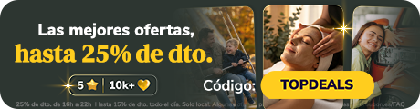 | | Centro Estetica Biouty Zen | | Limpieza facial y masaje a elegir en Centro Estetica Biouty Zen | Madrid, Madrid 4,78 (105) | | Alrededor de 550 vendidos | 60,00 € 29,99 € Desde 24,99 € La promoción termina el 1/3 | | | |  | | Solvisión | | Gafas graduadas monofocales o progresivas de primeras marcas | Varias localizaciones 4,79 (136) | | Alrededor de 5.000 vendidos | | 120,00 € Desde 34,95 € | | 31,49 € con el codigo TOPDEALS, Termina 25/2 | | | | | | |  | | Milita's Estética Avanzada | | Tratamiento HIFU 12D Ultra-lifting con radiofrecuencia | Madrid, Madrid 4,78 (150) | | Alrededor de 1.000 vendidos | | 300,00 € Desde 69,00 € | | 62,19 € con el codigo TOPDEALS, Termina 25/2 | | | |  | | Centro Estética Biouty Zen - Madrid | | Sesión de masaje relajante o descontracturante de 30 o 50 minutos | Madrid, Madrid 4,78 (105) | | Alrededor de 1.000 vendidos | | 30,00 € Desde 18,99 € | | 17,09 € con el codigo TOPDEALS, Termina 25/2 | | | | | | |  | | Menein Beauty Clinic | | ¡Adiós al vello no deseado! Sesiones de depilación con láser de diodo | Madrid, Madrid 4,19 (188) | | Alrededor de 350 vendidos | | 75,00 € Desde 29,00 € | | 26,19 € con el codigo TOPDEALS, Termina 25/2 | | | |  | | La Tomasa de Jorge Juan | | Cocina mediterránea para 2 o 4 personas en La Tomasa de Jorge Juan | Madrid, Madrid 4,5 (185) | | Alrededor de 1.000 vendidos | | 60,00 € Desde 29,95 € | | 26,99 € con el codigo TOPDEALS, Termina 25/2 | | | | | | |  | | Centro de Belleza y Estética Zoe | | Hifu 12D Ultra-lifting en cara, papada y cuello con radiofrecuencia | Madrid, Madrid 4,9 (10) | | 260,00 € Desde 69,99 € | | 62,99 € con el codigo TOPDEALS, Termina 25/2 | | | |  | | Soloptical | | Mira la vida con otros ojos con unas gafas de vista o de sol graduadas | Varias localizaciones 4,84 (2.693) | | Alrededor de 25,000 vendidos | | 120,00 € Desde 59,95 € | | 56,99 € con el codigo TOPDEALS, Termina 25/2 | | | | | | |  | | Gaia Peluquería y Estética | | Sesión de peluquería con lavado, corte, tinte o mechas y peinado | Madrid, Madrid 4,17 (149) | | Alrededor de 1.000 vendidos | | 40,00 € Desde 14,99 € | | 13,49 € con el codigo TOPDEALS, Termina 25/2 | | | |  | | Restaurante Arrabal | | Cocina tradicional española para 2 personas en Restaurante Arrabal | Madrid, Madrid 4,64 (14) | | Alrededor de 200 vendidos | | 75,41 € Desde 49,99 € | | 44,99 € con el codigo TOPDEALS, Termina 25/2 | | | | | | |  | | Autoescuela Motorhome | | Curso de moto A1 o A2 | Madrid, Madrid 4,55 (11) | | Alrededor de 1.000 vendidos | | 481,00 € Desde 19,99 € | | 17,99 € con el codigo CARCARE, Termina 25/2 | | | |  | | Estética Virginia | | Reflexología podal de 45 minutos para 1 persona en Estética Virginia | Madrid, MADRID 4,96 (24) | | Alrededor de 300 vendidos | | 40,00 € 14,99 € | | 13,49 € con el codigo TOPDEALS, Termina 25/2 | | | | | | |  | | Canoe | | Menú de pizza con parking y 2 rascas para 2 personas en Canoe | Madrid, Madrid 4,55 (279) | | Alrededor de 250 vendidos | | | | |  | | Arrocería Casa Andreea | | Delicioso menú de arroz de marisco o verdura con 3 entrantes | Madrid, Madrid 4,56 (177) | | Alrededor de 1.000 vendidos | | 71,00 € Desde 39,99 € | | 35,99 € con el codigo TOPDEALS, Termina 25/2 | | | | | | |  | | Restaurante Abadia | | Tapeo de 5 medias raciones | Madrid, Madrid 4,43 (56) | | Alrededor de 1.000 vendidos | | | | |  | | Centro De Masajes De Filipinos... | | Ritual filipino con masaje en pareja | Madrid, Madrid 4,84 (176) | | Alrededor de 1.000 vendidos | | 90,00 € Desde 56,99 € | | 51,29 € con el codigo TOPDEALS, Termina 25/2 | | | | | | |  | | Scalpel Madrid | | Tratamiento reafirmante inyectado en tercio superior facial y retoque | Madrid, Madrid 4,9 (39) | | Alrededor de 150 vendidos | 350,00 € 169,99 € Desde 139,49 € La promoción termina el 1/3 | | | |  | | Valverde | | Menú cachopón en el restaurante Valverde ★★★ | Madrid, MADRID 4,42 (121) | | Alrededor de 1.000 vendidos | | 69,90 € Desde 32,99 € | | 29,69 € con el codigo TOPDEALS, Termina 25/2 | | | | | | |  | | Masajes De Filipinos Sol | | Ritual filipino con masaje en pareja de 50 minutos | Madrid, Madrid 4,82 (83) | | Alrededor de 300 vendidos | | 90,00 € 56,99 € | | 51,29 € con el codigo TOPDEALS, Termina 25/2 | | | |  | | Preciados 38 | | Jarras de cerveza o tinto de verano y medias raciones en Preciados 38 | Madrid, Madrid 4,17 (24) | | Alrededor de 350 vendidos | | 24,75 € Desde 12,99 € | | 11,69 € con el codigo TOPDEALS, Termina 25/2 | | | | | | | | | |