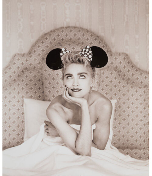 This playful photograph of Madonna by Herb Ritts remains among his most iconic images. Ritts, a renowned American fashion photographer of the 1980s and 1990s, was celebrated for his beautifully printed, strikingly composed, and sensuous black-and-white portraits of supermodels and celebrities. Taken during Madonna's 1987 Who's That Girl World Tour-her first international tour-this intimate and stripped-down portrayal offered fans a fresh glimpse of the star, deepening their connection with her.