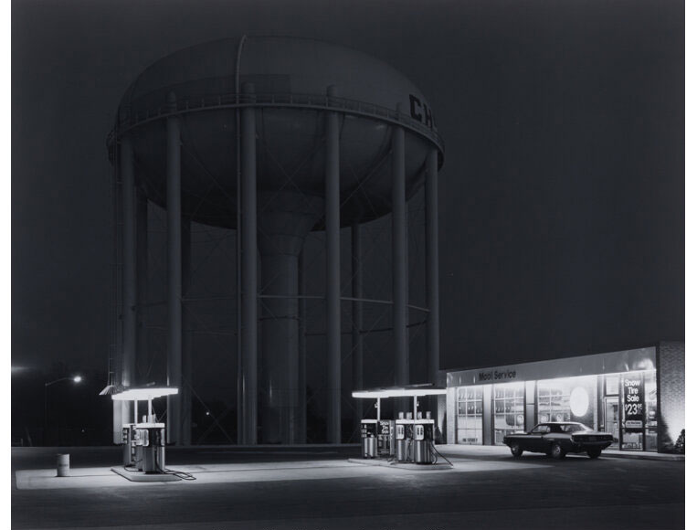 George A. Tice (1938-2025) was a celebrated American photographer known for capturing the quiet dignity of everyday life, particularly in his native New Jersey. His iconic image Petit's Mobile Station and Water Tower, Cherry Hill, New Hill, New Jersey, November, 1974 exemplifies his mastery of light, atmosphere, and composition. Tice used a long exposure to isolate the glowing gas station at night, later comparing the placement of the water tower to Lincoln Cathedral in Frederick Evans' 1898 photograph. This print, made in 1975, is an early example—evident in the misspelling of "Mobil," the use of Agfa Brovira paper, and his earlier "Geo. A. Tice" signature, all markers that predate the refinements of his later editions.