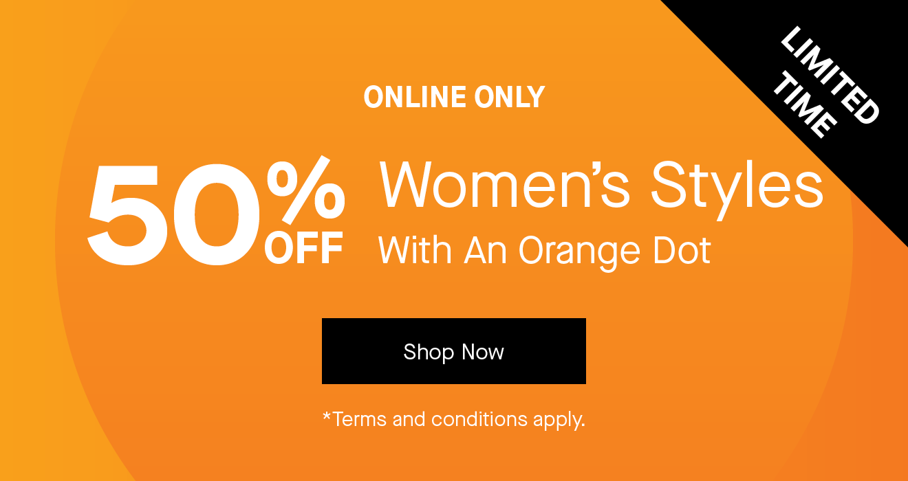 *Orange Dot - Valid online only on selected Women's styles marked with an orange dot. While stocks last. Prices as marked. Not in conjunction with any other offer. Number One Shoes + Hannahs reserves the right to amend, extend or discontinue this promotion at any time.