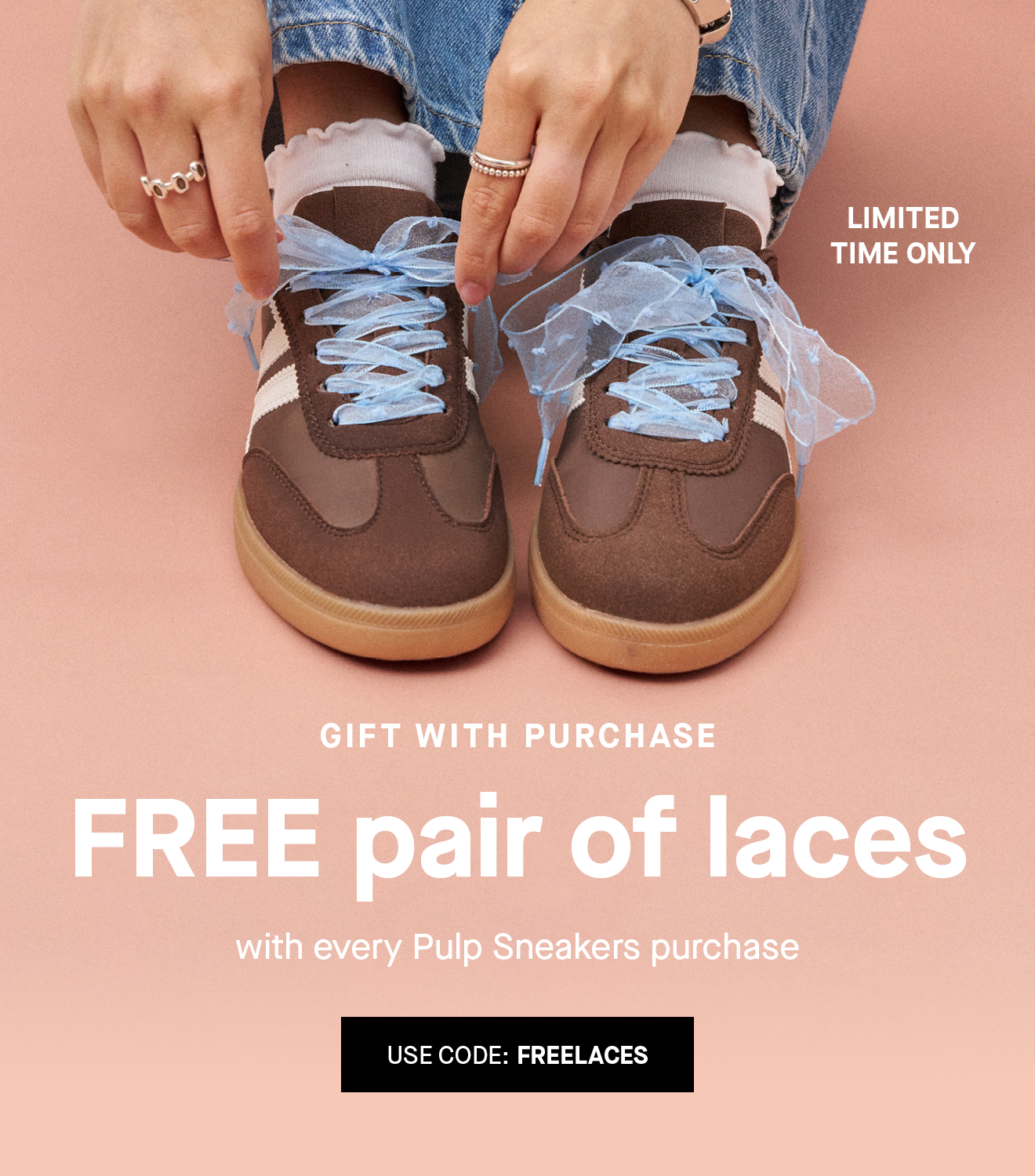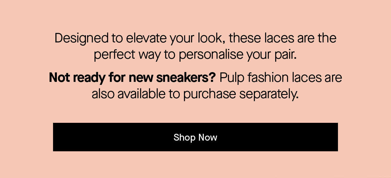 *Free Laces: One free pair of fashion laces (valued at $9.99) with every pair of Pulp sneakers purchased. Available for a limited time only. Online, use code FREELACES at checkout. In-store, the discount will be applied at checkout. Stock may vary by store. Number One Shoes + Hannahs reserves the right to amend, extend or discontinue this promotion at any time.