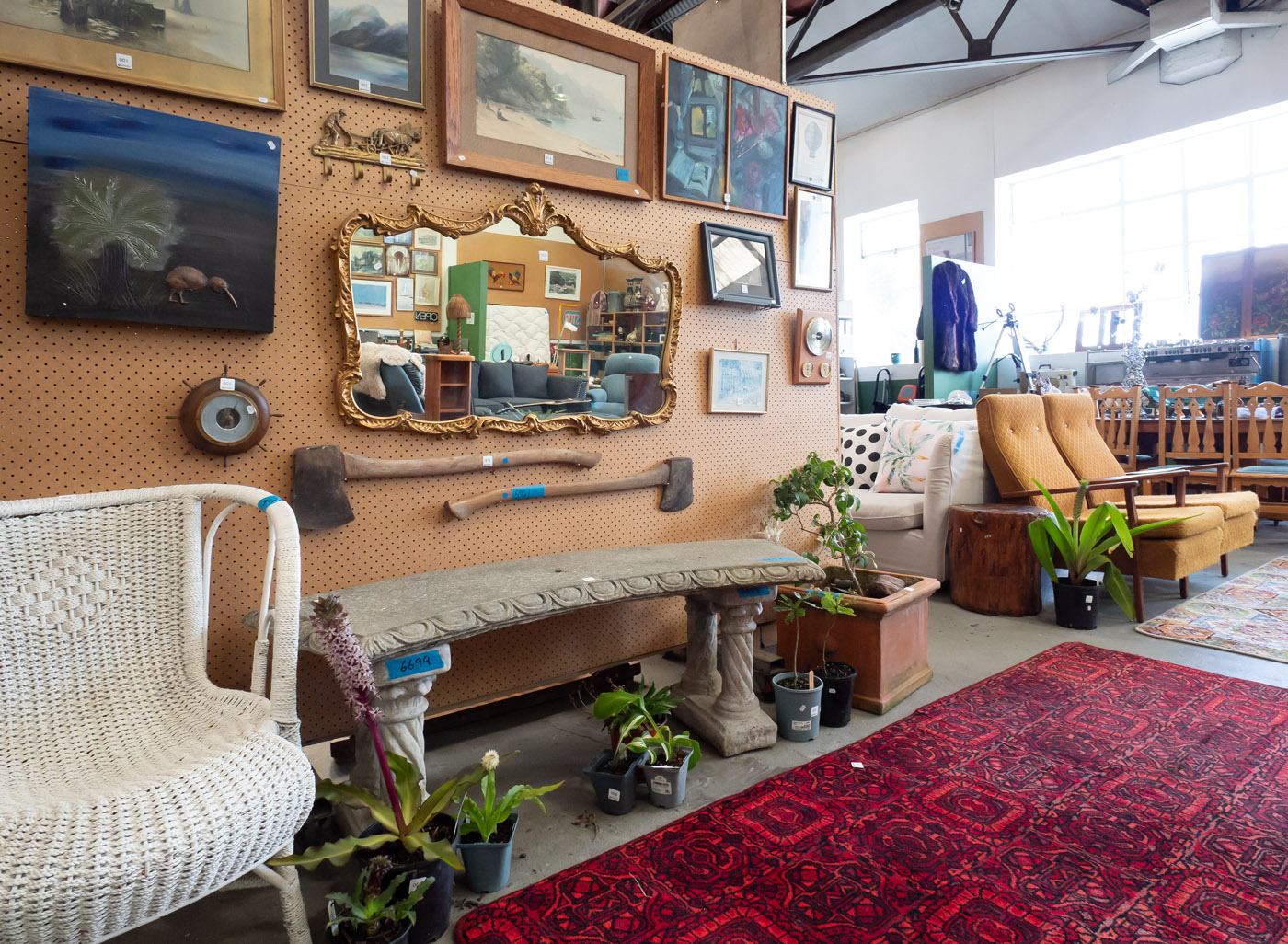 In furniture, we have a charcoal upholstered chesterfield 3 seater settee with matching ottoman and dome trim, a contemporary cream linen 3 seater and other fabric or leather covered settees, lounge and occasional chairs. Solid pine bedroom furniture, vintage, reproduction and contemporary rimu, oak, mahogany and mirrored chests, bedside cabinets, cupboards, sideboards, desks, tables and chairs vintage child’s chairs and a nice concrete garden bench.