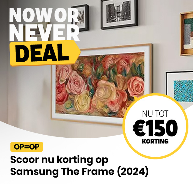 NOW OR NEVER: Alléén dit weekend ontvang je tot €150 korting op Samsung The Frame (2024). Met de gratis lijst, dunne muurbeugel en One Connect Box gaat deze iconische televisie als een schilderij op in jouw interieur. Profiteer snel want op=op!