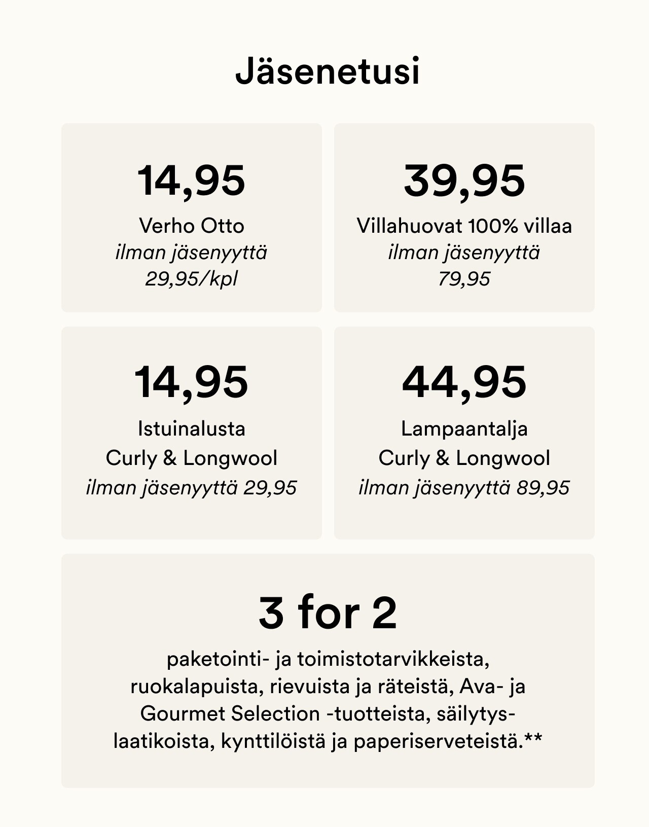 Ilman jäsenyyttä 29,95/kpl. Voimassa toistaiseksi. Ei voi yhdistää muihin tarjouksiin.