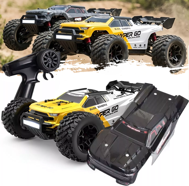 MJX Hyper Go 14208 Ă€r en radiostyrd monster truck i skala 1/14 med en topphastighet pĂ„ upp till 40 km/h. Fyrhjulsdrift och oljefyllda stötdĂ€mpare ger stabil körning och bra grepp i terrĂ€ng. Den borstlösa drivlinan har aktiv kylning pĂ„ bĂ„de motor och ESC för jĂ€mn prestanda. Levereras med batteri och laddare â redo att köra. đđš