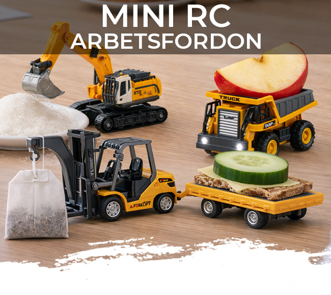 Kolla in vår senaste nyhet – Mini RC Arbetsfordon i skala 1/64! Perfekta för lek på köksbordet, vardagsrumsbordet eller varför inte på skrivbordet på kontoret. Här är det bara fantasin som sätter gränserna. Välj mellan tre roliga modeller – grävmaskin, dumper eller gaffeltruck – och skapa din egen lilla arbetsplats hemma.
