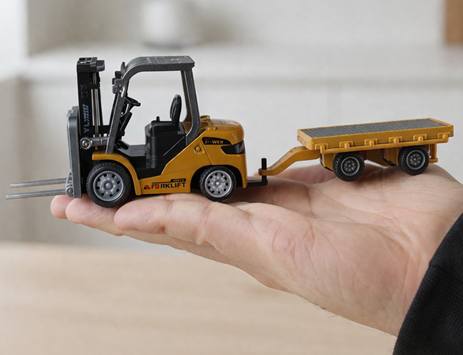 Mini RC Gaffeltruck som kan köra fram och tillbaka, svänga höger och vänster samt höja och sänka gafflarna. Utrustad med ljus och ljud för en mer realistisk upplevelse. Har demofunktion och tre justerbara hastigheter. Levereras med släp och kan enkelt växlas mellan gafflar och krok för fler användningsområden. Styrs med 2,4GHz kontroll eller med en APP - För störningsfri körning.
