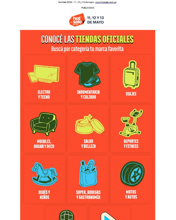 Las ofertas de Hot Sale son realizadas en forma directa por las Empresas Anunciantes y no por CACE y son válidas para compras a través de los canales online de los Anunciantes del 11/05/26 al 13/05/26. Consulte las condiciones de cada oferta en los sitios de los Anunciantes. CACE no controla ni es propietaria ni responsable de las ofertas. Hot Sale es una marca registrada. Lista de Anunciantes Oficiales y Términos y Condiciones de la Acción en www.hotsale.com.ar. |