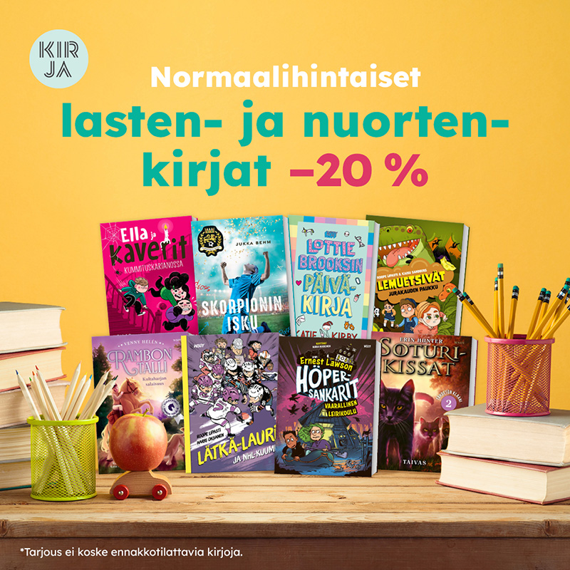 Elokuu kutsuu uusien lukuseikkailujen pariin! Koulun ja esikoulun alkamisen kunniaksi tarjoamme normaalihintaiset lasten- ja nuortenkirjat 20 % alennuksella vielä 11.8.2025 asti. Tutustu koko valikoimaan ja löydä uusia lukuelämyksiä loppukesään! Tarjous ei koske ennakkotilattavia, tilauksesta painettavia kirjoja eikä erää signeerattuja kirjoja. Hinnat on laskettu kirjoihin valmiiksi.