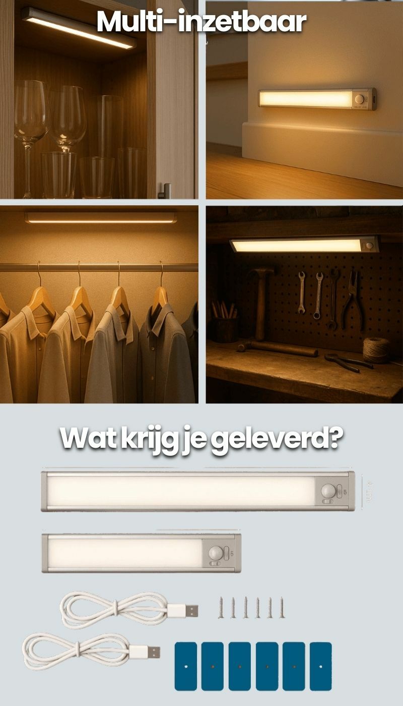 | Deze oplaadbare lichtbalken (2-pack) gaan automatisch aan bij beweging en werken volledig draadloos. Geen snoeren, geen stopcontacten, alleen gemak. Perfect voor kast, trap, gang of keuken! |
