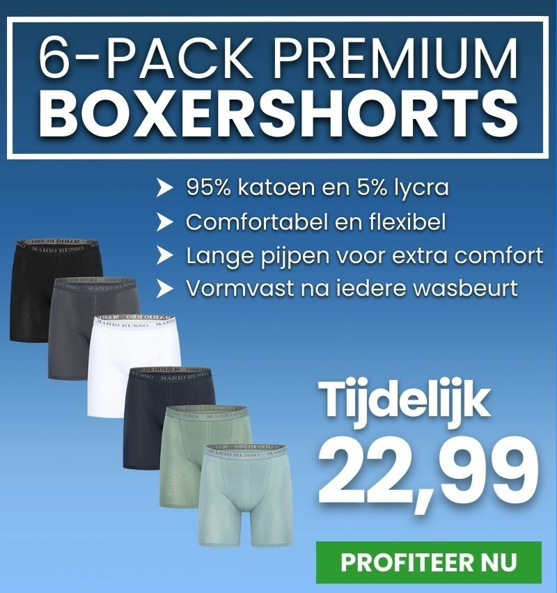 Shop nu een 6-pack premium boxershorts voor 22,99Topkwaliteit voor een bodemprijs én nu met extra lange pijpen voor extra comfort!