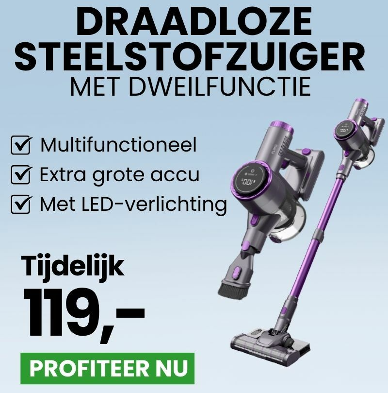 | Stofzuigen én dweilen in één keer! Onze draadloze steelstofzuiger met dweilfunctie maakt je vloer in één keer schoon. Geen snoeren, geen gedoe, snel, efficiënt en superhandig. Slim schoonmaken begint hier. |