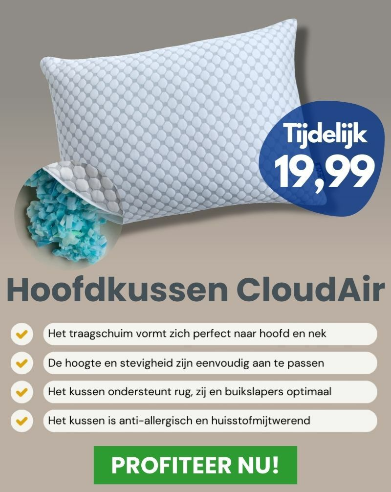 Het CloudAir Hoofdkussen vormt zich perfect naar je hoofd en nek voor optimale ondersteuning en ultiem comfort. Ademend, heerlijk zacht en ideaal voor zij- en rugslapers 🩻 een verschil dat je direct voelt.